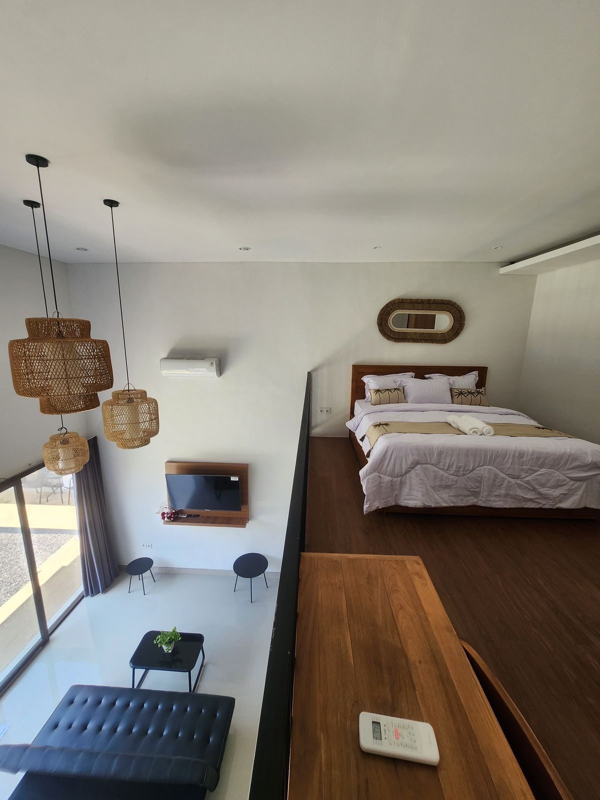 新建獨家屋頂公寓,共用花園和遊泳池。現代化的簡約室內設備。包括設備齊全的廚房,配備感應調理設備、飲水機、咖啡機、磁鐵、冰箱和餐具、配有沙發和迷人雞蛋椅的客廳、寬屏電視。 空調設備齊全。花園和泳池景觀。配備加大雙人牀的臥室。步行2分鐘即可抵達自動取款機的便利店,開車5分鐘即可抵達沙努爾和海灘,開車10分鐘即可抵達Dps市中心,開車25分鐘即可抵達國際機場