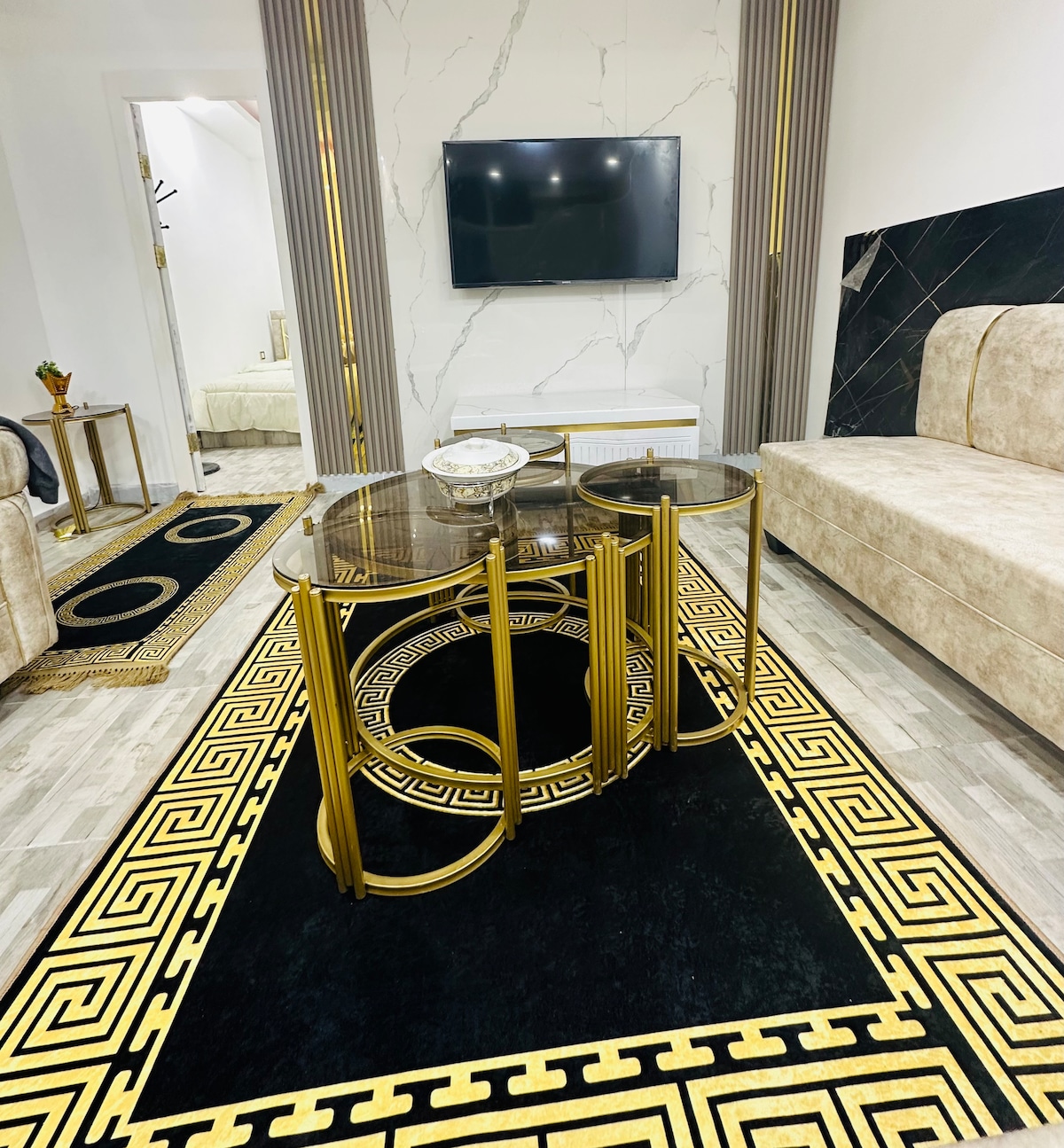 入住這個時尚的房源,與全家人一起享受樂趣。 設備齊全的三臥室公寓,靠近喜來登酒店-皇冠廣場-麗思卡爾頓飯店,六個圓圈,靠近非常獨特的景點區域的金門商場。 Carrfour -咖啡店-步行不到10分鐘即可抵達黃金商場