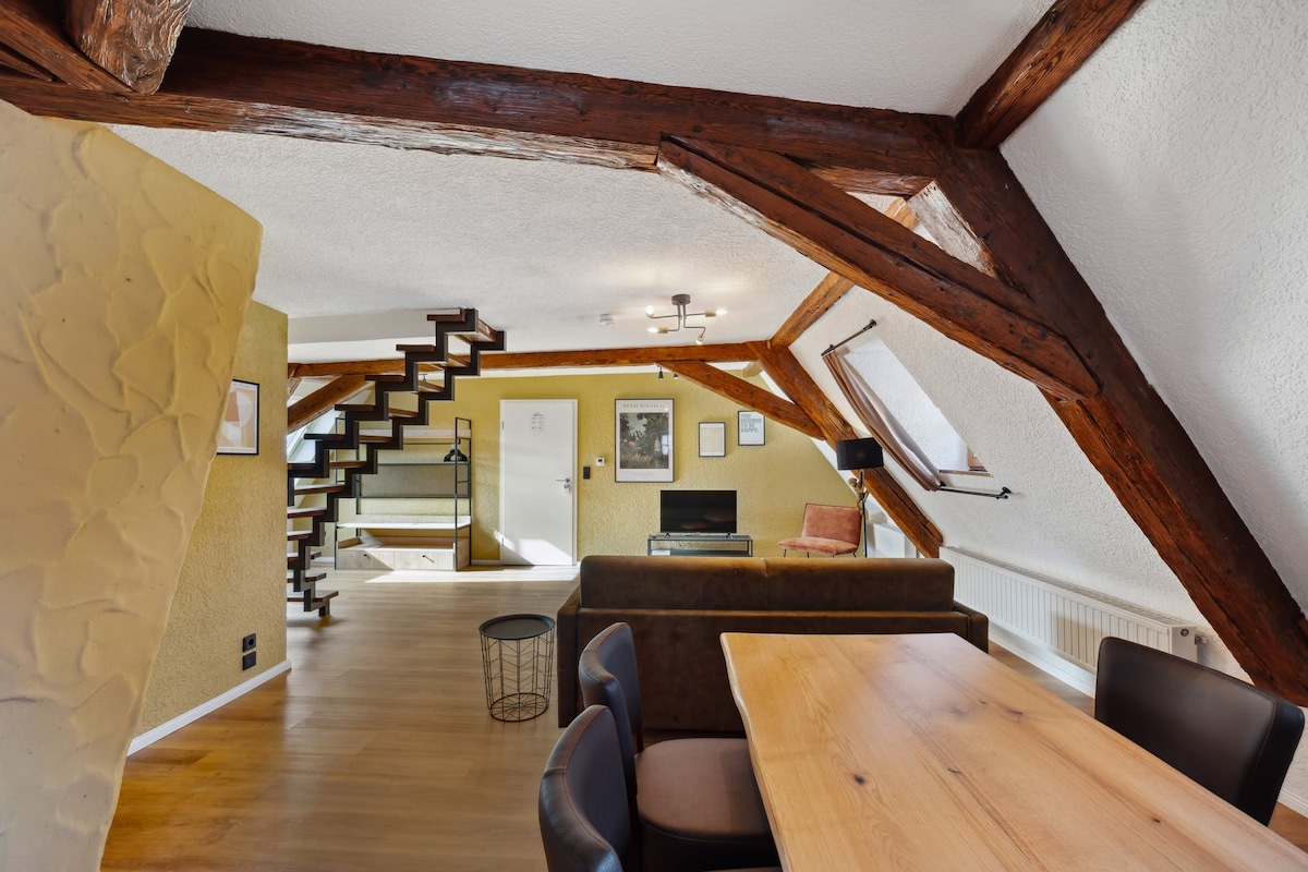 班貝格寬敞的頂層公寓 •可預訂地下停車位(額外收費) •主臥室按摩浴池,讓您放鬆身心 •大露臺可供逗留 • 3間臥室,配有加大雙人牀+兒童房 • 2間配備淋浴間的現代化浴室 •可供6名以上兒童入住–非常適合家庭和情侶 ——— •門外有巴士站,方便探索 •班貝格大教堂、舊市政廳、阿爾滕堡Altstadtgassen •享受:抽啤酒、咖啡館、餐廳、 •步行即可抵達購物場所
