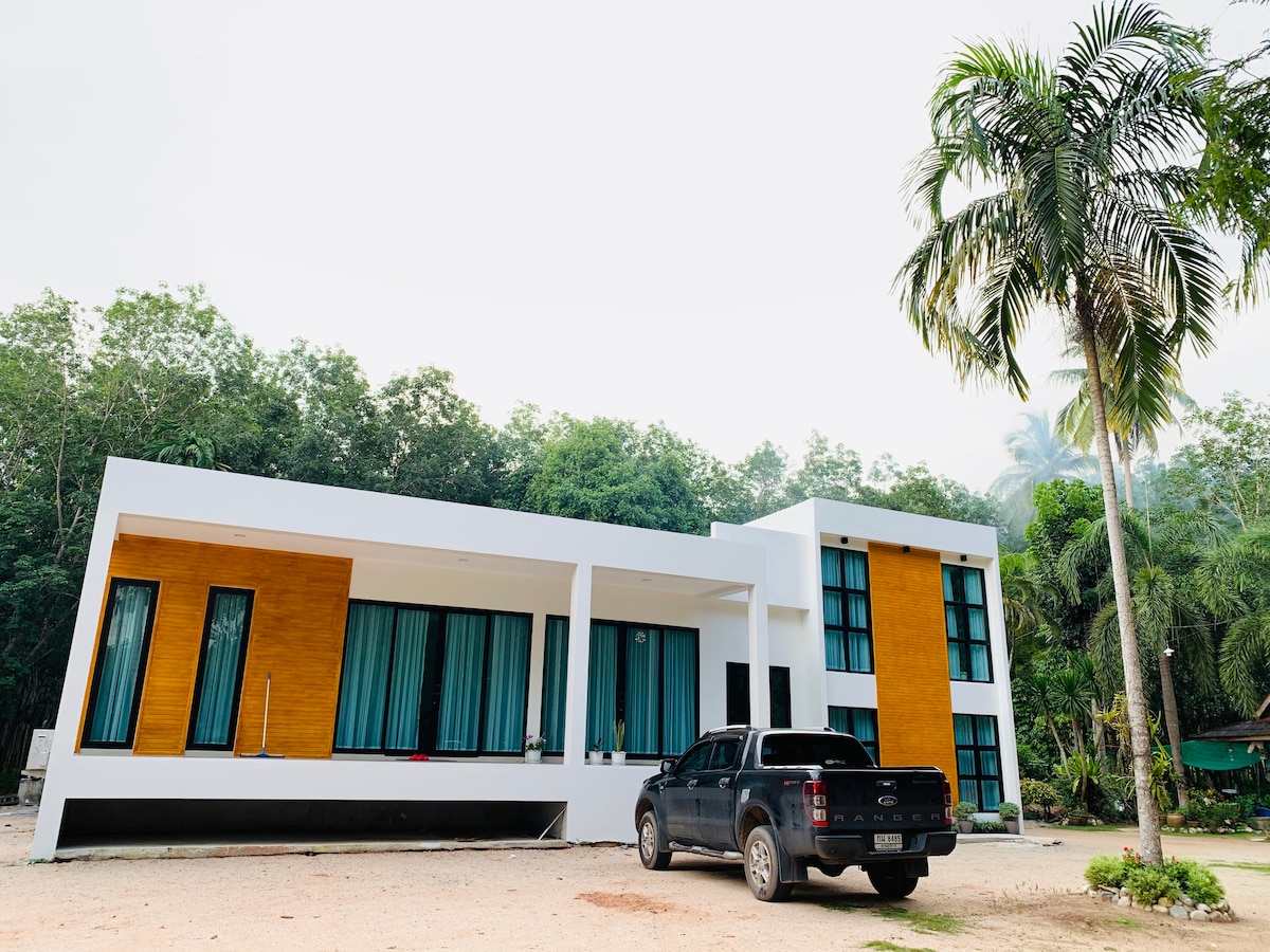 你好,靠近通往hat yaï - Suratthani - 曼谷的高速公路。 完整的住宿,獨立,位於主要由榴蓮組成的果園。 位於安靜的區域,您可以聽到鳥鳴聲。 住宿由一間大型空調臥室組成,還有一個風扇、一間浴室、另外兩間臥室目前沒有家具。 住宿非常乾淨,可以進出整個花園。 門前就有停車位、監控攝影機和Wi-Fi。