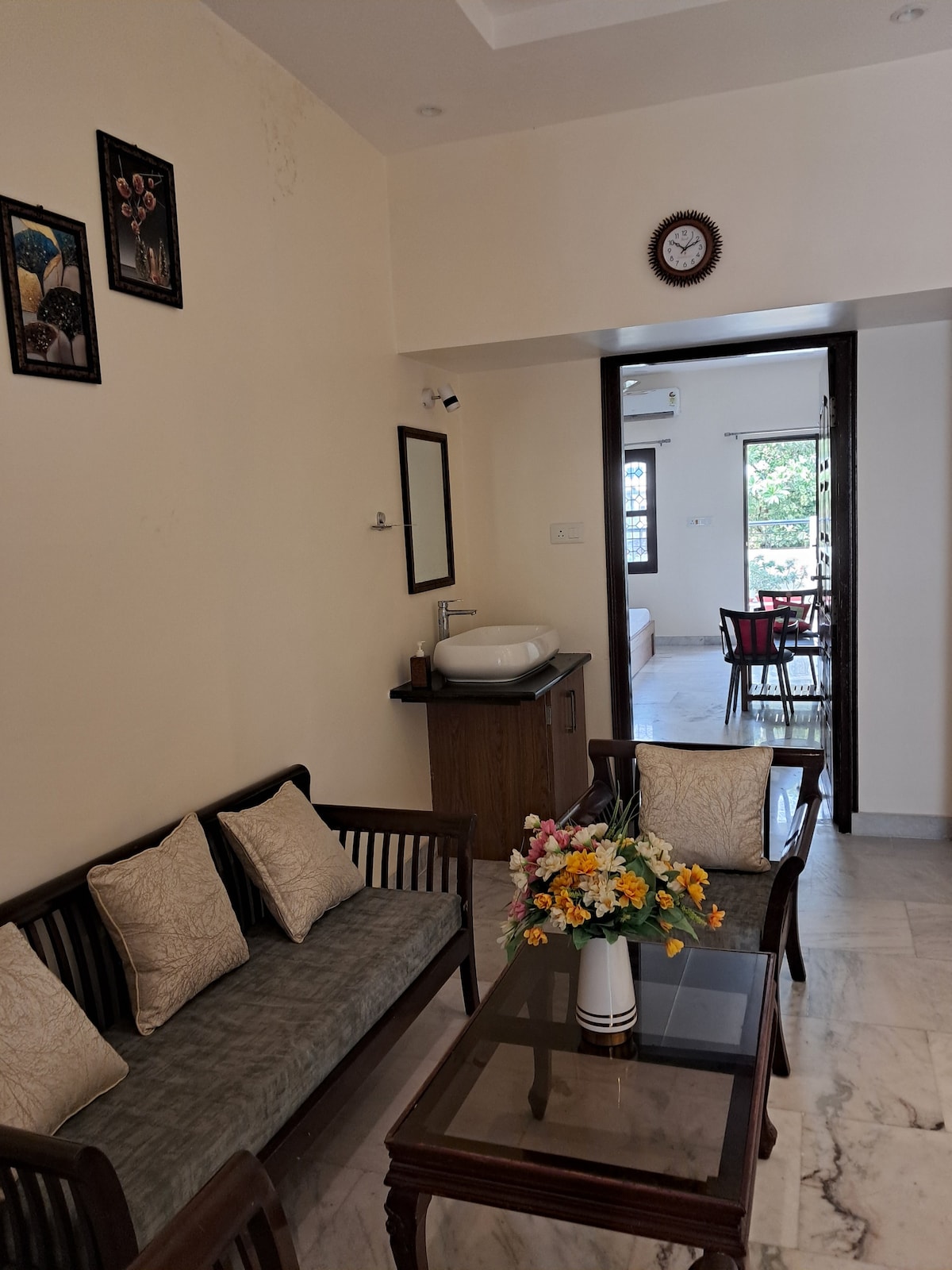 1)獨立樓層,1000平方英尺公寓+120平方英尺陽臺 2) 零外部干擾 3) 10分鐘從Blinkit、Zepto和Instamart送達雜貨 4)免費迎賓小吃+茶/咖啡牛奶 5) 200 Mbps光纖WiFi –非常適合遠距工作 6) 15–20分鐘即可抵達Assi Ghat , 30–45分鐘即可抵達主要景點。交通選擇24小時全天候可用 7)醫生、看護和業主全天候待命 8) 免費客房清潔 9)與科技、科學和醫學創始人同住 10) 24 小時全天候外送服務,由 Swiggy & Zomato 提供