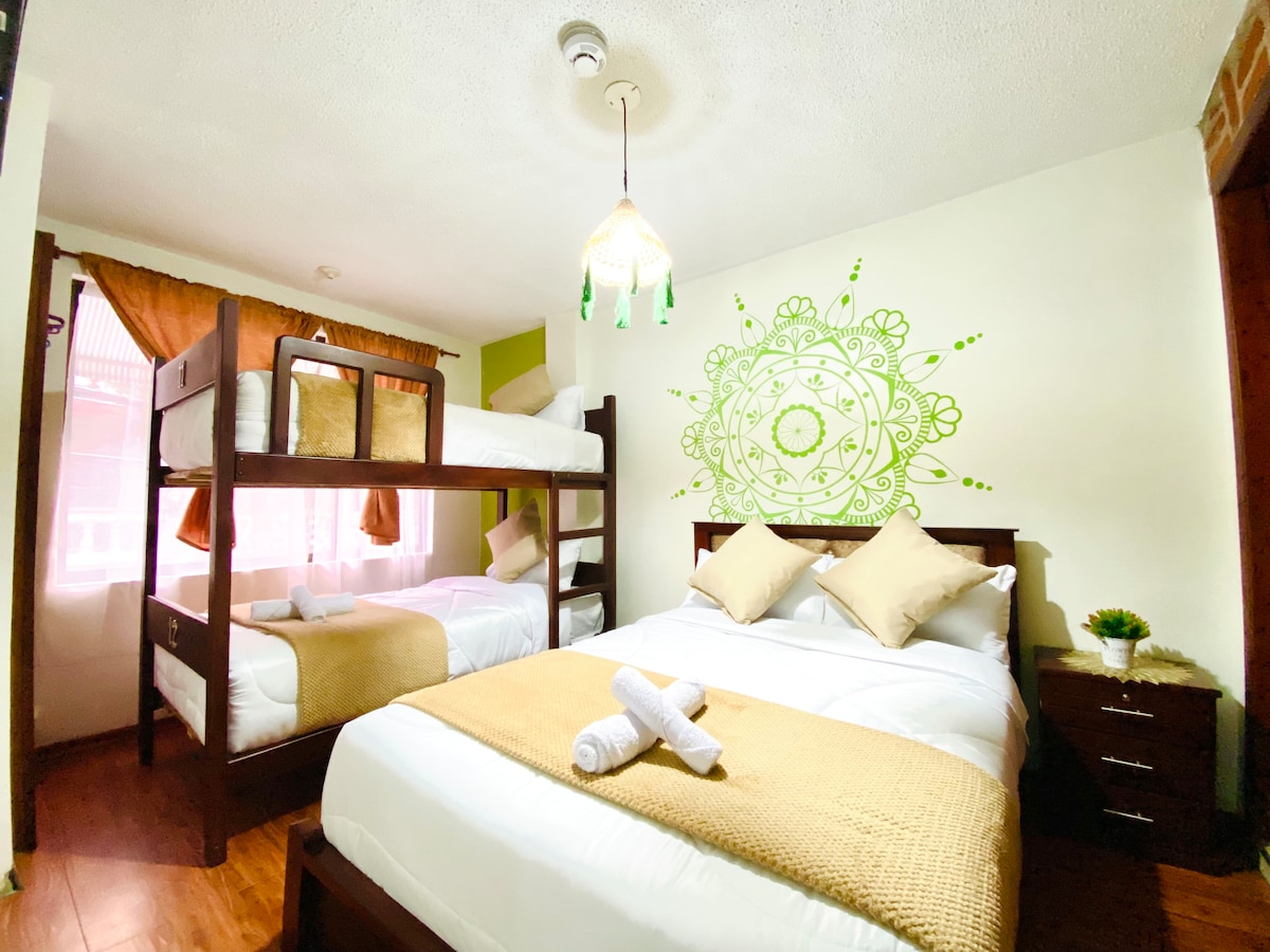 房間# 2 , 1張雙人牀,配有2張牀,浴室獨立, Agua Caliente , WiFi ,車庫,公共區域–花園,客廳,俯瞰通古拉瓦火山、巴尼奧斯市和山脈的露臺。 我們距離市中心、El Salado溫泉泳池、動物園、水族館等步行7分鐘。 從機場和厄瓜多各地的交通服務,計程車24小時洗衣服務(洗衣)