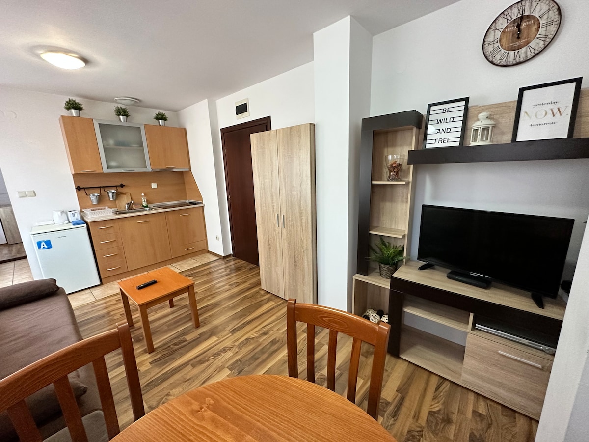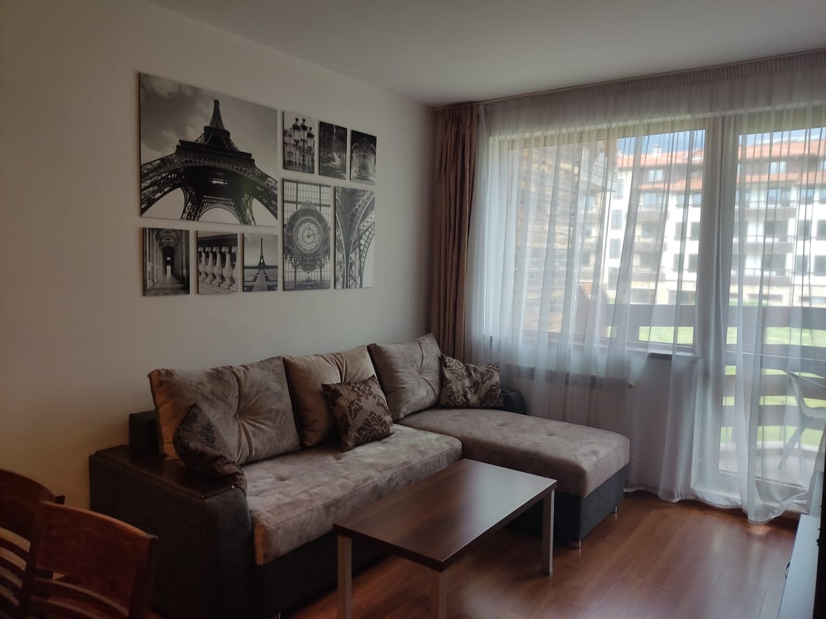 The comfortable apartment is located 100 meters from the ski lift in the complex "Bansko Royal Towers" The apartment ideal for 4 persons 1 bedroom with a bed 1 sofa bed for 2 persons 1 bathroom fully equipped with all amenities For you in the apartment - air conditioning, fully equipped kitchen, TV, internet Shops, restaurants, ski equipment rental within walking distance View of ski slopes and mountains For an additional fee - Gym are also located on same complex