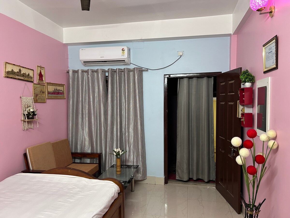 Reconnect with loved ones in this family-friendly place.Humare is sundar aur saaf-suthre 2BHK apartment mein aapka swagat hai. Ye jagah families aur doston ke liye ekdum sahi hai. Khaas Baatein: Air Conditioning (AC): Garmi se bachne ke liye poori suvidha. Beds: 2 bade double beds aur extra mattress ki suvidha. Balcony: Yahan se aap bahar ka nazara dekh sakte hain aur taza hawa le sakte hain. Connectivity: High-speed Wi-Fi available hai