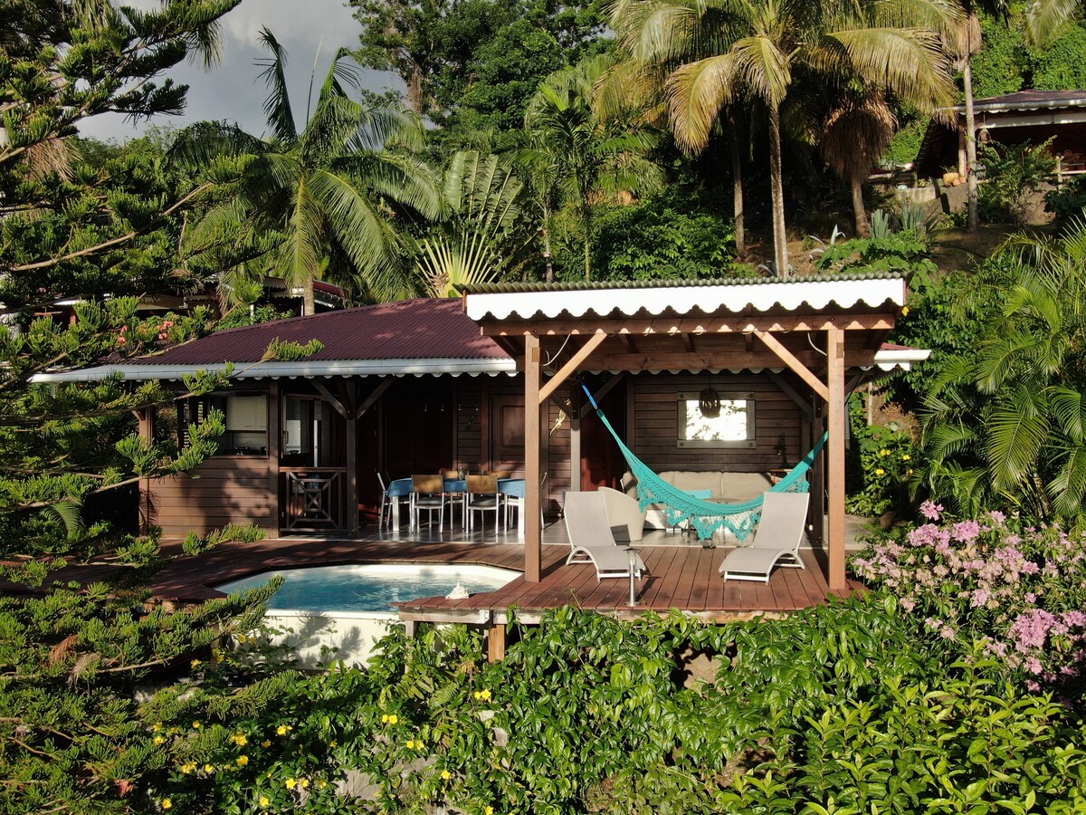 In a setting of tropical vegetation, our small family structure is made up of three independent wooden bungalows around a large salt pool. Depending on the season, you can enjoy the many flowers and fruits in our garden. We are located on the heights of Deshaies, 50 meters from the Botanical Garden. Breakfast in supplement is served on reservation and in complete privacy on your terrace.