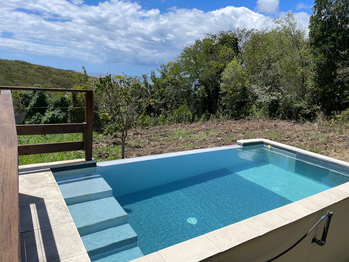 木製別墅,地理位置理想,海景和山景。這棟別墅由2間空調臥室和2間浴室組成。 它裝潢品味高雅,設備齊全的開放式廚房、客廳、露臺、泳池和按摩浴缸。非常適合家庭度假、探索瓜德羅普、低地和海牀的綠色旅遊。 建議您在家準備餐點或與您一起準備,探索當地特色菜餚! !