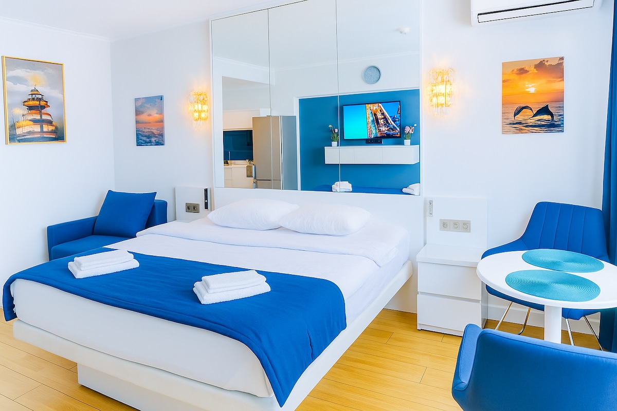 令人驚嘆的公寓,位於新摩天大樓(2023年投入使用),可欣賞令人驚嘆的全景海景,與華美達廣場飯店、億萬富翁賭場、維多利亞水療中心、餐廳、Spar商店位於同一棟大樓。 靠近海灘和阿爾多加尼湖( Lake Ardogani )的跳舞噴泉。 公寓配備了舒適住宿所需的一切設備,包括廚房、烹飪用具、冰箱、洗衣機、空調、熨鬥、熨衣板、吹風機、大電視。 超級舒適的180牀墊。