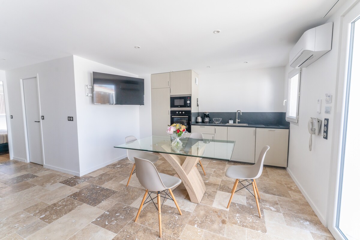 Welcome to our brand-new aparthotel, designed to combine comfort, elegance and a warm atmosphere. Located in the heart of Salles, just steps away from shops and local amenities, it offers the ideal setting for your stay. Each apartment features a private bathroom, WC, a fully equipped kitchen and a dining area. Free on-site parking included. High-speed Wi-Fi, ideal for both personal and professional use. A welcoming and carefully designed place.