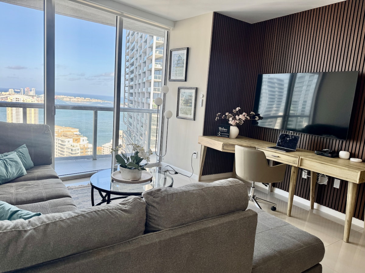 *Only paid parking available*. Welcome to our stunning brand new studio on the 32nd floor in the heart of Miami! Enjoy a luxurious stay with breathtaking city views. Walk to top attractions like the Adrienne Arsht Center, Pérez Art Museum, and Bayside Marketplace. Just a short drive away, you'll find South Beach nightlife, the Design District, and Vizcaya Museum and Gardens. Create unforgettable memories during your stay. There's $35 plus taxes per night booked resort fee, card only at check-in