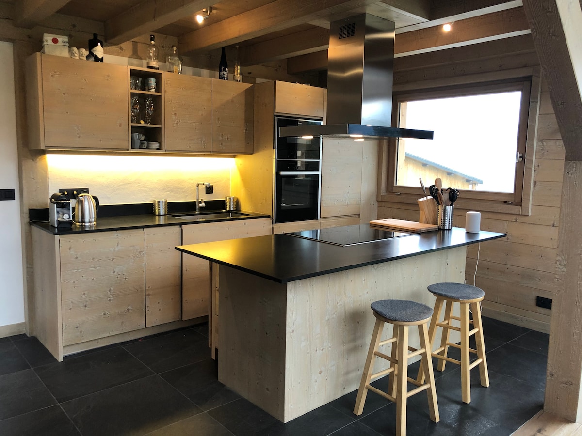 Grand chalet panoramique (190m2) face au Mont Blanc et proche d'un lac de baignade. Classé 4 épis. 4 chambres spacieuses (literie en 3*160cms et 2*90cms). 3 salles de bain dont 2 avec grande douche italienne et 1 avec baignoire. Sauna traditionnel avec vue panoramique par son hublot géant, vrai moment de détente et de récupération après l'effort ! Home Cinema - Babyfoot BONZINI - Enceinte CABASSE- Plancha Gaz etc...