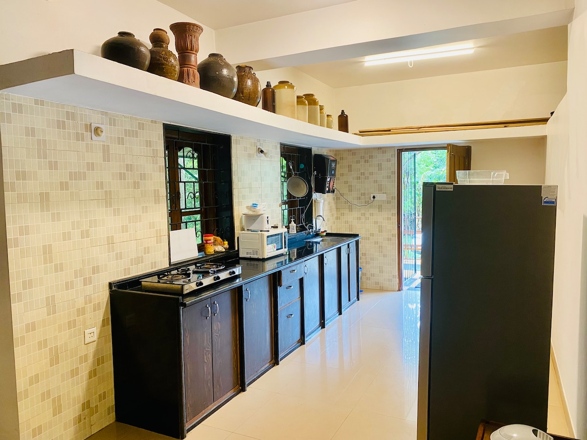 Discover deep calm at Happy Moon Homestay, an eco-friendly escape in Goa’s lush village. Away from crowded beaches, this peaceful gated villa is surrounded by garden trees and stays naturally cool, with beaches just 25 minutes away. The premises have CCTV and RFID entry for added security. Enjoy 24-hr power backup, AC rooms, hot water, 200MBPS WiFi, RO water, washing machine, fridge, and a fully equipped kitchen. Guests also receive curated travel itineraries, and our praised home-cooked meals.