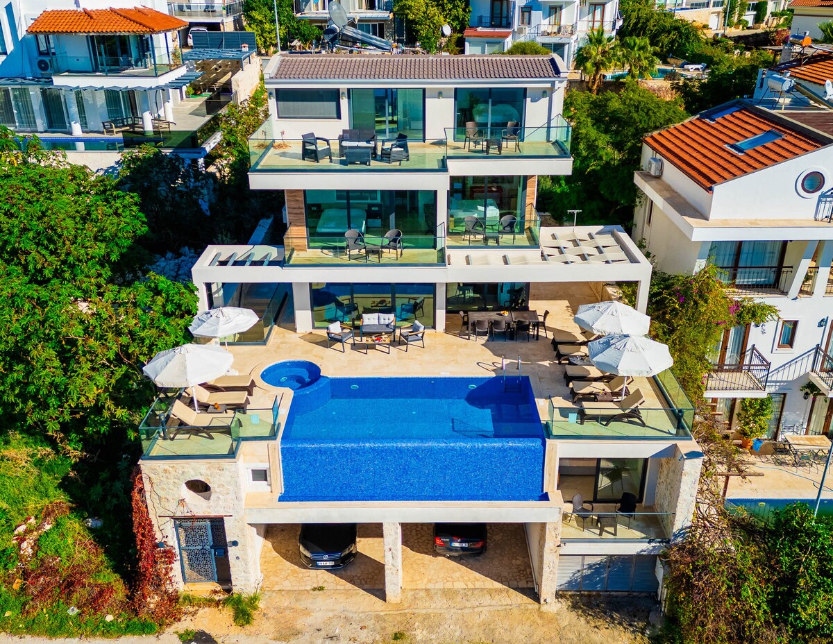 位於Kalkan最令人嚮往的海岸飛地之一的現代地中海度假勝地。 這座現代化的四臥室別墅坐落在安靜、安全的死胡同,距離卡拉馬爾灣的藍綠色水域僅幾分鐘路程,結合了高級設計、令人驚嘆的海景和罕見的寧靜感—步行即可抵達卡拉馬爾最好的海灘俱樂部和餐廳。 它設計在四個樓層,可舒適地容納多達八位房客,在每個轉彎處融合隱私、光線和奢華。