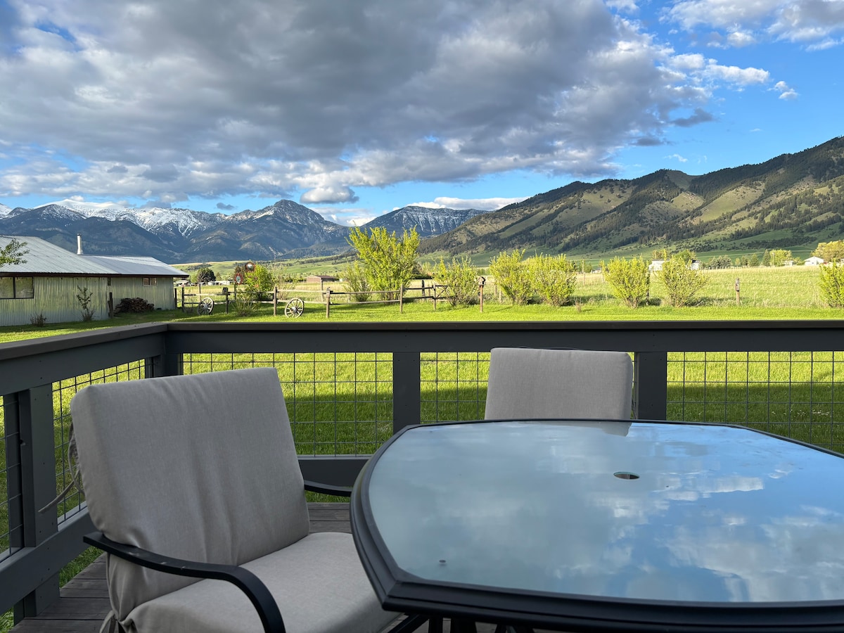 Enjoy views of the Bridger Mountains off the deck. This property is situated on a 10 acre horse farm just 15 minutes west of Bozeman. 20 minutes from the airport & 5 minutes from numerous restaurants and coffee shops. Sit and relax as horses meander about and start their day. 2minutes north is Cottonwood Hills Golf Course. Fish in the Gallatin River or soak in Bozeman Hot Springs just 5 minutes away. Fantastic hiking, biking, whitewater rafting, skiing and many other outdoor activities