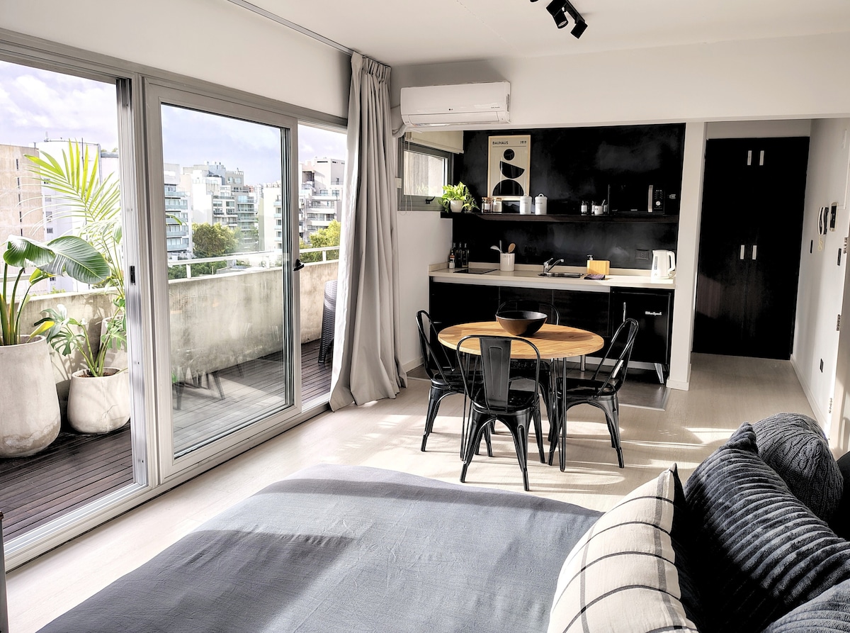 Brand new studio apartment with kitchinette, bathroom and balcony with great views in the heart of Recoleta. Cool modern decoration, fully equipped and safe. SmartTV with cable and Netflix (login with your account). Building with great facilities: heated indoor pool, outdoor pool with solarium, spa with massage room and sauna, and gym. Walking distance to the best restaurants, bars and cafes, as well as to bus and subway station.