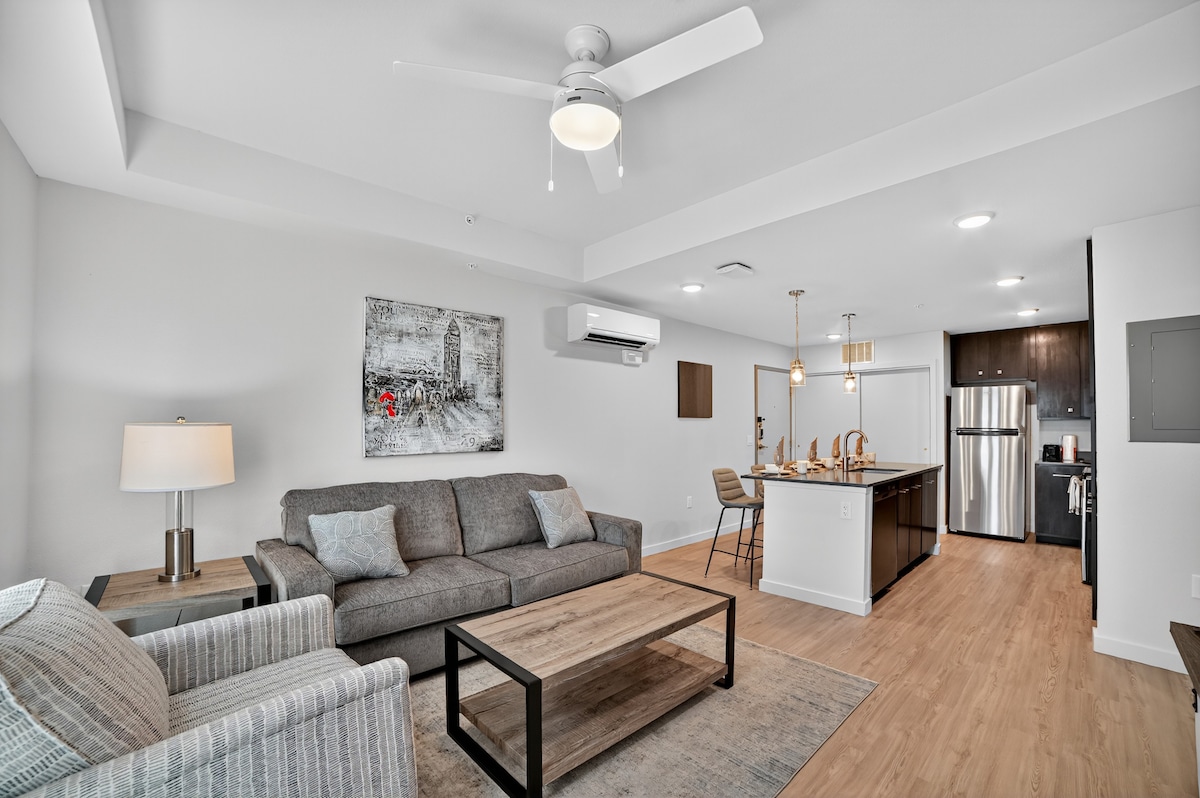 我們舒適的 1 間臥室公寓是尋求舒適和便利的情侶或獨遊旅客的完美度假勝地。 步入室內,在裝飾精美的客廳放鬆身心,配備55英寸4K Roku電視,非常適合電影之夜或追看您最喜愛的節目。 迷人的臥室配有豪華的雙人床、專用的工作桌,以及充足的衣櫃空間,可容納您的所有物品。 享受寬敞的花園浴缸和雙洗手台,讓您的住宿放鬆。