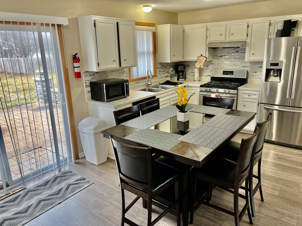 獨戶房屋一樓整層兩間臥室、兩間浴室。1350平方英尺。自助入住。中央空調。車道停車。房東住在下層單位,獨立入口。1英畝,樹木茂盛的後院。 距離I90/39-出口Rockton Rd. 4英里。 羅克福德以北11英里 開車7-8分鐘即可抵達森林保護區、雜貨店。 非常適合商務差旅人士、情侶。8歲以下兒童的安全問題。 介紹一下您自己,為什麼在該地區,您與誰一起旅行,以及您已閱讀並同意《房屋守則》。