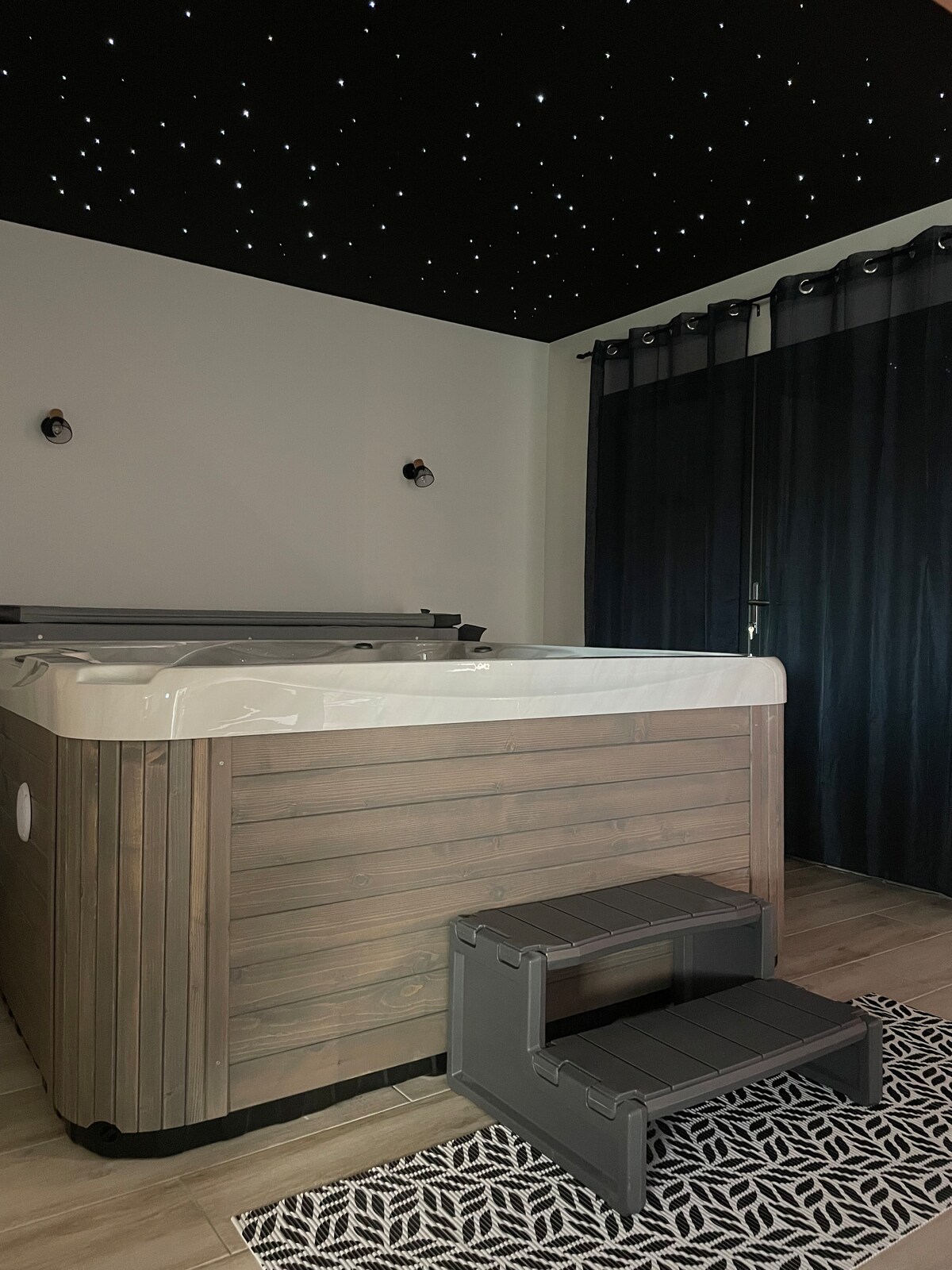 Bienvenue dans votre Love Room privative avec accès autonome. Prenez le temps de prendre soin de vous !🧘 On vous donne le remède : Pour commencer, profitez de la salle de bain double douche🚿 puis prélassez-vous dans un jacuzzi🫧 92 jets, 5 places. Ensuite purifiez-vous dans le sauna infrarouge 🏜️suivi d'une douche bien fraîche❄️. Il est temps de s'hydrater sur la terrasse privée 🍹. Enfin laissez-vous sombrer dans les bras de Morphée dans une chambre cocooning 🛌 Options sur demande.