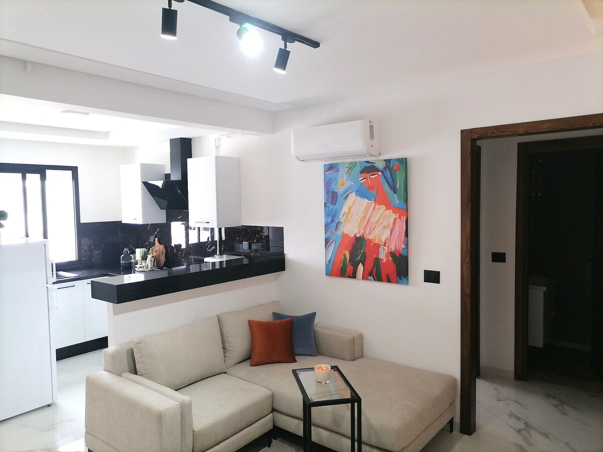 在這個安靜舒適的住所放鬆身心,設備豪華,裝飾和諧,確保您有一個愉快的住宿體驗。 公寓位於安靜的住宅區,包括一間帶沙發床的客廳、一間帶陽臺的臥室和一個設備齊全的小廚房。 📍靠近所有便利設施:家樂福、餐廳、咖啡廳、酒吧、健身房、藥局等。 距離突尼斯迦太基機場 5 分鐘。
