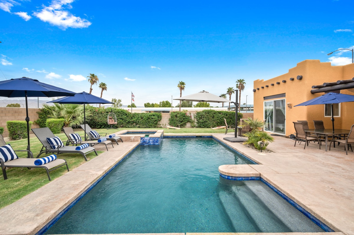 歡迎來到科切拉谷的珠寶。帶上家人和朋友分享這個聖塔菲瑰寶,有2個停車位和充足的空間。5間臥室、3間浴室、美食廚房和精心佈置的家具歡迎您進入。室外-享受巨大的鹽水Pebble Tech泳池、可容納8人的按摩浴缸、全新的高級戶外廚房和巨大的禪宗戶外區域,讓您放鬆身心。距離印第安威爾斯網球場、El Paseo、帝國馬球場/科切拉音樂節(Coachella Fest)幾分鐘路程,沒有理由住在其他地方。