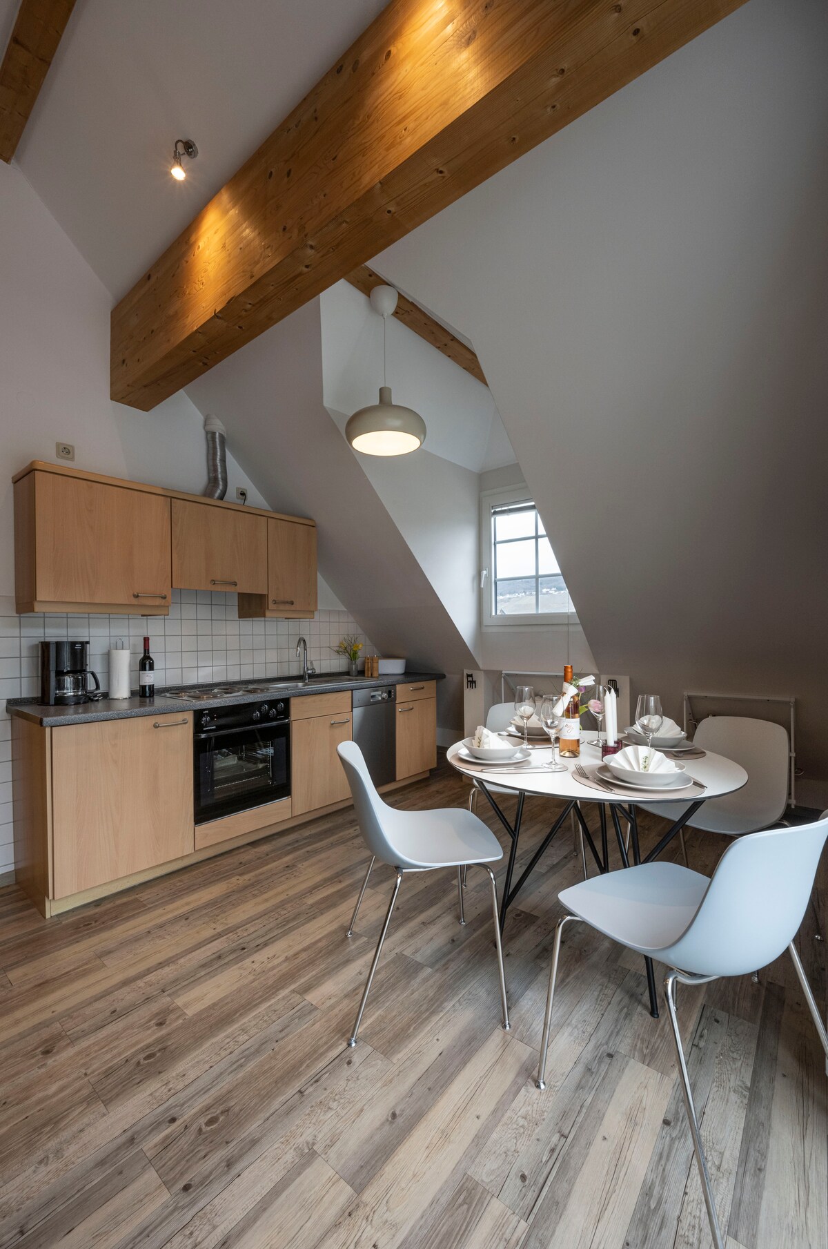 ZoHe India × 85 sqm penthouse apartment × 2 bedrooms, each with a king-size box-spring bed (180x200 cm) × 1 sofa bed (140x200 cm) × 50 sqm rooftop terrace with stunning views of Bernkastel’s historic old town × Fully equipped kitchen – induction stove with integrated extractor, oven, toaster, electric kettle, and more × Bed linen and towels included × Walk-in shower × Complimentary soap, shampoo, and shower gel × Free ultra-fast fiber-optic Wi-Fi × Free parking space