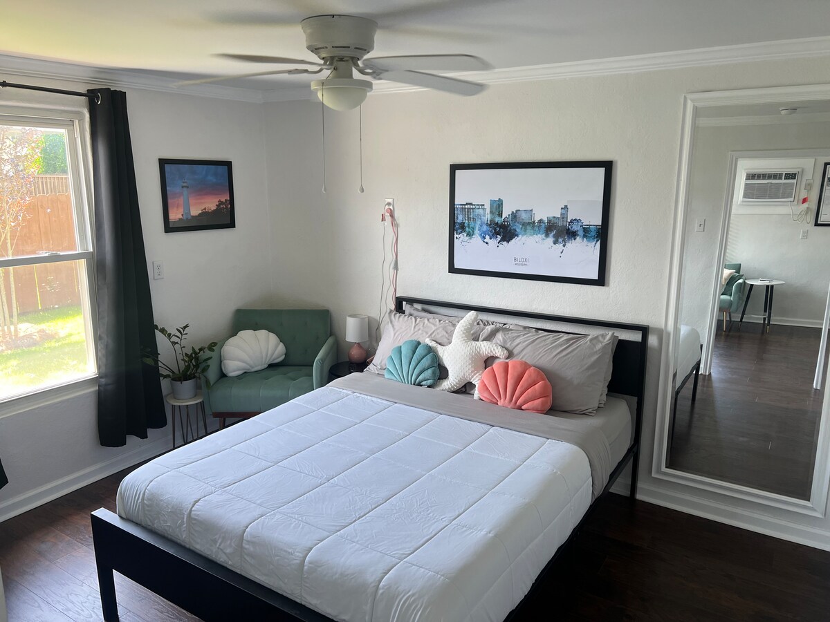 Keesler附近的全套單間公寓(388平方英尺),對面有海灘、餐廳和商店。拐角處有公共巴士站和前往賭場的接駁車。WiFi和小型智慧電視。您可以無鑰匙進入,然後去游泳、享受海鮮或在賭場享受樂趣。安全照明和無樓梯,讓您有賓至如歸的體驗。我的房源非常適合情侶和獨行冒險者。 禁止拖車停車。 最多入住人數為2人:違規會導致驅逐。