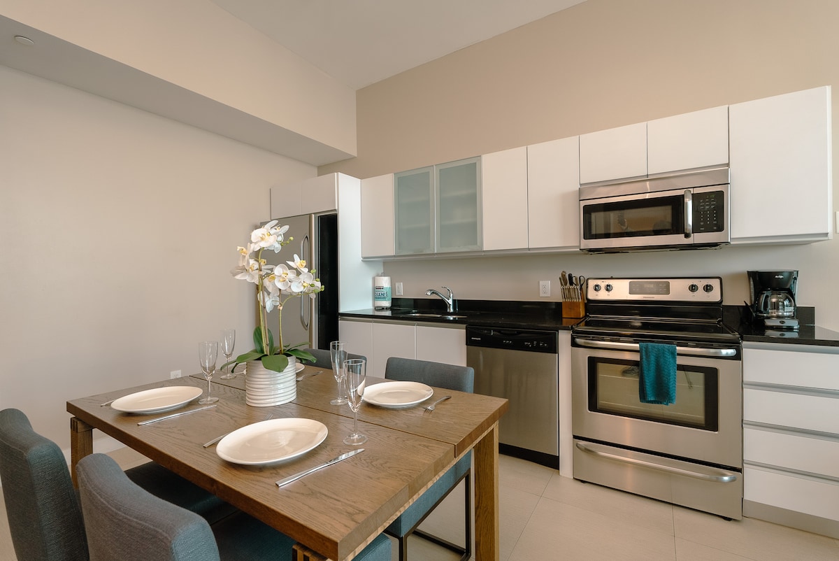 Entire luxury condo at Quadro in the Design District. Fully equipped - Free parking, coffee, Wi-Fi & cable. The building features amenities in the 6th floor including a fitness center, a lounge with co-working area & a game room, an outdoor dining area with BBQ's and a great pool.Enjoy guest exclusive neighborhood discounts. Walk to hundreds of designer shops, restaurants, bars, art galleries, & more! 10-min drive to Miami’s international airport, 15-min drive to Miami Beach.