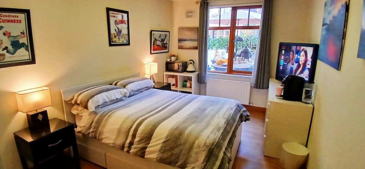 寬敞、明亮、現代化的寬敞雙人臥室(5英尺床)、美麗的套房。非常私密。獨立入口。密碼鎖匙盒。私人停車位。位於安靜的死巷。距離機場20分鐘。靠近M50和Luas ,前往市中心的巴士服務非常好(巴士站距離單間公寓5分鐘)。包含冰箱/冷凍庫、微波爐、水壺、烤麵包機、吹風機、熨斗和熨衣板。提供歐陸早餐。Sky TV、NETFLIX和WiFi。靠近村莊,有超市、酒吧、餐廳和外賣。