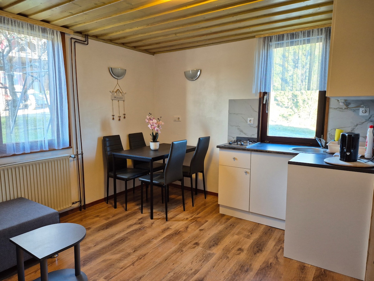 房源位於一個安靜的地方,我們有4間公寓和3間豪華露營小屋。前面有一個草坪,您可以用來娛樂。此房源適合家庭和房客入住。這是徒步旅行周圍的朱利安阿爾卑斯山的好起點,在村裡是自行車道的起點。公寓適合殘疾人士入住。旅遊稅為每人每晚 2 歐元,不包含在價格中。 公寓不適用於派對。 晚上 10 點至早上 7 點為安靜時段。