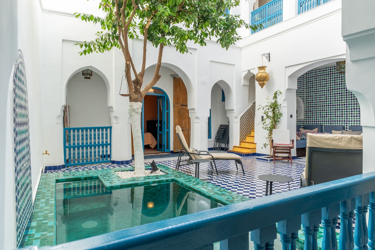 摩洛哥傳統庭院位於馬拉喀什的麥地那,在一個安靜的區域,距離露天市場僅幾分鐘路程,距離Jemaa El Fna僅12分鐘路程,是一個安靜的天堂,有2個溫水泳池、按摩浴缸、土耳其浴室和按摩室。 無線網路連線,結合摩洛哥的現代舒適性和真實性。 我們的5間空調房配有獨立浴室,經過全面翻修,每間都以調解的優雅和清醒為個性化。 我們邀請您在幾天的時間內成為馬拉克基