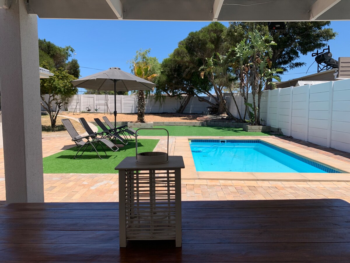Stunning home with 3 en suite bedrooms, huge entertainment area, swimming pool, large garden and all the comforts of a well established home. The downstairs bedroom has a Murphy bed, with a very comfortable queen mattress We have solar and batteries so load shedding is not an issue. Some of the world’s best kitesurfing beaches are on your doorstep.
