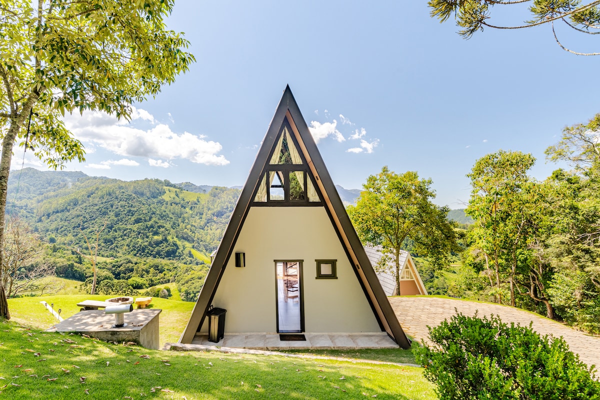 72 平方公尺(三角屋風格)小木屋(獨立),有 2 間臥室,景觀令人驚豔。 我們不提供早餐 我們不接受寵物 我們不接受電動車 ✔ 壁爐 40 吋智慧✔電視 ✔ 無線網絡 居家辦公✔桌 ✔ 廚房 廚房和浴室的✔熱水 ・✔ 嬰兒牀 Nespresso✔ 咖啡機 吹✔ 風機 ✔ 創始人設備 ✔ Alexa 玻璃小屋前有色光療法✔水力按摩 外部區域: 配備燒烤、水槽和餐桌的美食✔區 ✔ Campfire ✔ 1 Pergolado ✔ 停車位