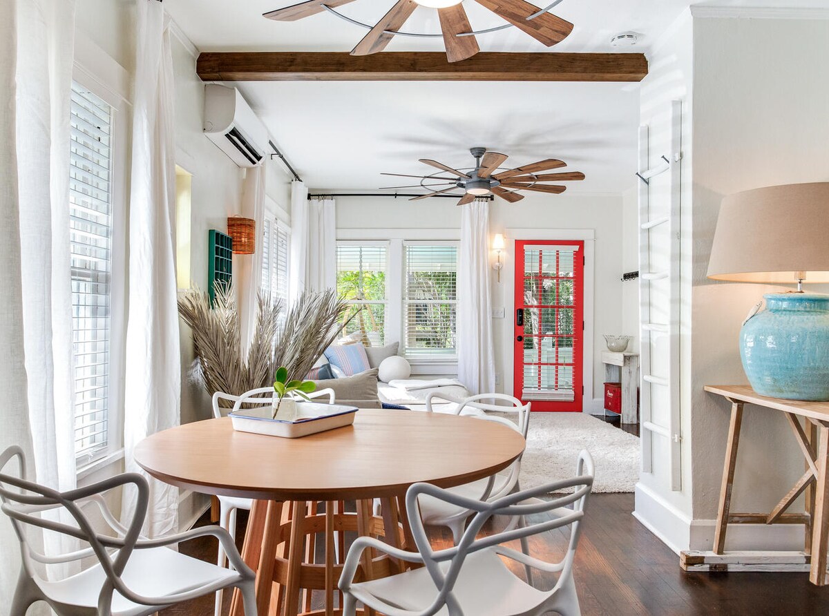 This newly constructed carriage house was built to embrace the character and charm of the main house, a 1928 craftsman bungalow. Your 2nd floor 1 BR apartment is well appointed with a full chef's kitchen, a living room with a pull-out sofa, and washer/ dryer. Enjoy a morning cup of coffee or a glass of wine in the evening on the large porch. 2 min walk to Grand Central restaurants, coffee shops, boutiques, or grab a bike or scooter for a 5 min ride to Downtown St. Pete or 15 to the beaches.