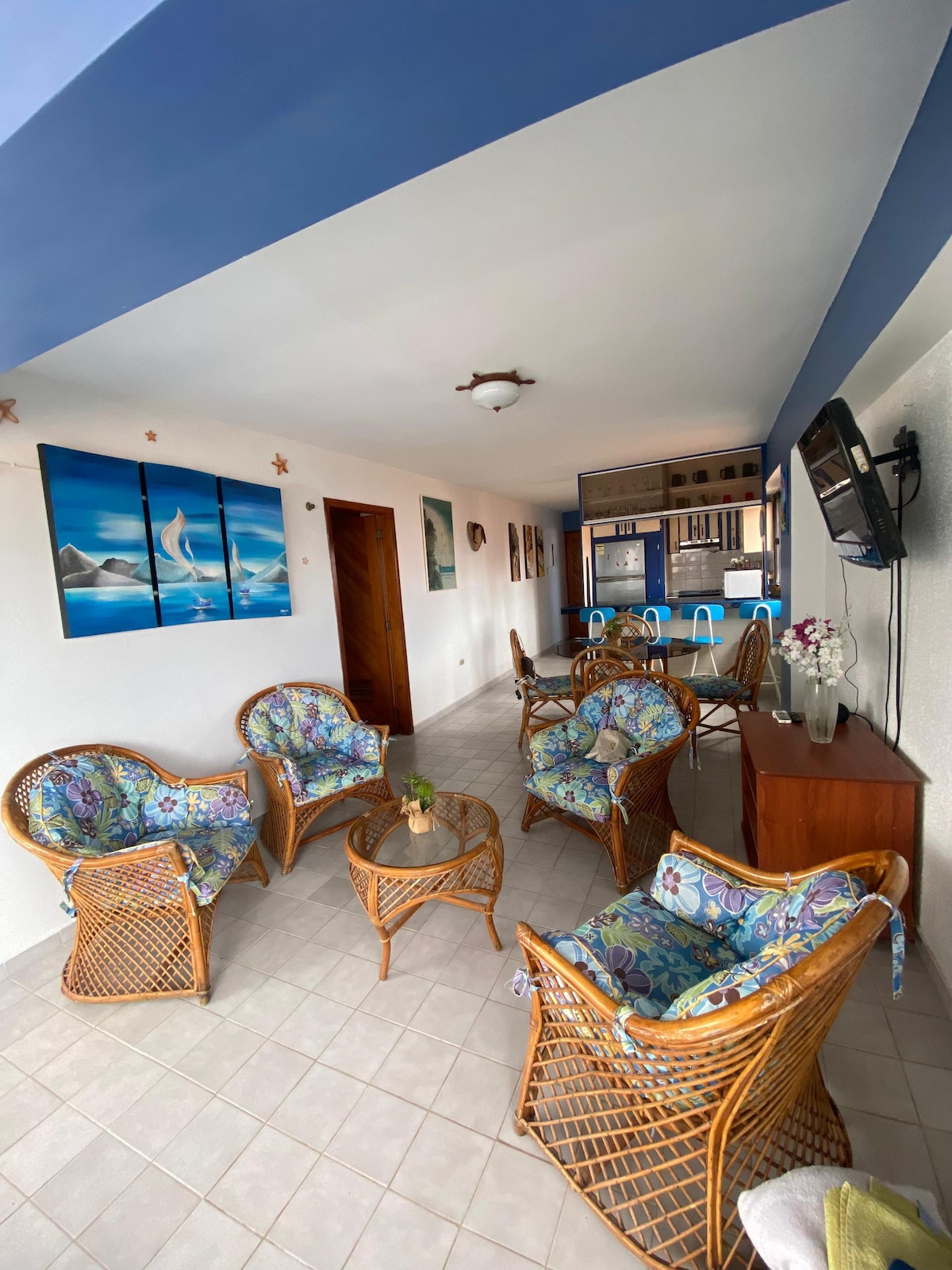 Hermoso Penthouse Vacacional frente al Mar para 8 pers. * 1 Habitacion con 2 camas matrimoniales *Sala con 2 sofacamas matrimoniales. * 3 baños completos * Desayunadero *Nevera * 1 puesto estac techado. * Ventana panorámica con vista al mar. * 2 Hamacas * Terreza privada ✅ Utensilios de cocina. Airfare ✅Cocina electrica , otra cocina con Bombonas de Gas ✅lencería. ✅Wifi ✅1 Smart TV pantalla plana El Conjunto tiene piscina y parrilla *Penthouse Equipado.
