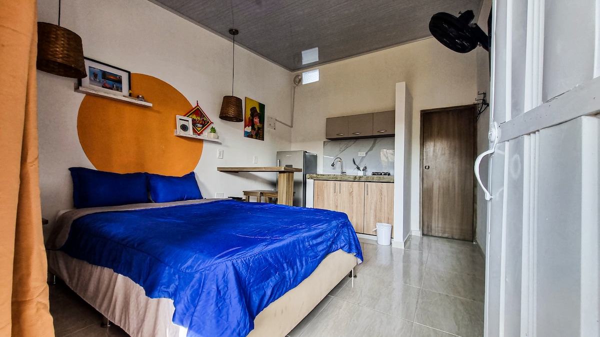 Este alojamiento único tiene mucho espacio para que disfrutes con los tuyos, tiene una habitación, su baño privado, cocina, sala, espacio para colgar una hamaca, pueden dormir cómodamente 4 personas. Además cuenta con parqueadero privado y área de labores. Buen sector, cerca al aeropuerto, centros comerciales y supermercados a pocos metros. La Playa de la ciudad esta a 1.5 km y el barrio es un sector acogedor.