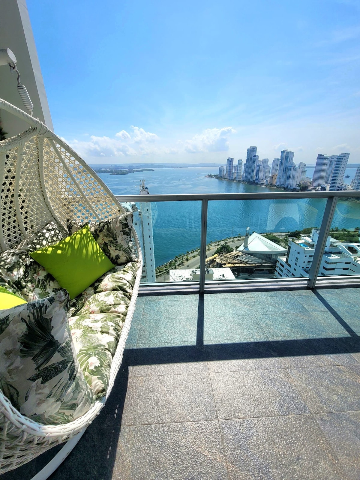 Exclusive 30th floor apartment Morros City with incredible and captivating sea and historic center views. Master bedroom with direct sea view and balcony access. Full kitchen, 2-in-1 washer and dryer, 60" Smart TV, 500MB fiber optic WiFi. Beachfront Bocagrande with luxury amenities: pool, jacuzzi, Turkish bath and gym. Free parking. Ideal for couples seeking the most exclusive experience from the highest available floor in all Cartagena