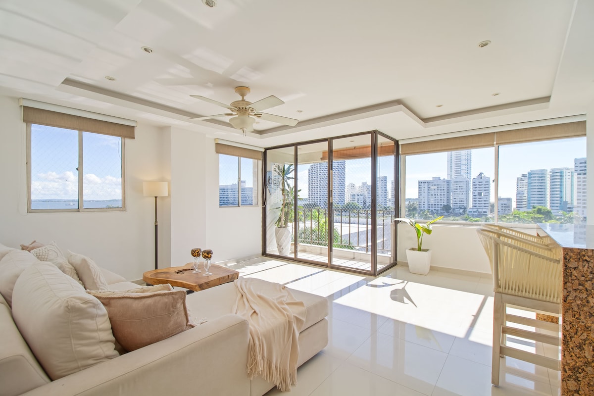 在卡塔赫納放鬆身心,欣賞壯麗的海景、Tocahagua大樓、El Laguito。 放鬆聆聽海浪的聲音,欣賞卡塔赫納最美的日落,欣賞海景和蒂埃拉博巴島的全景。 公寓位於希爾頓飯店附近,步行 2 分鐘即可抵達 Laguito 和 Bocagrande 海灘。 乘坐計程車 10 分鐘即可抵達歷史中心和 Getsemaní 街區,以及酒莊碼頭。