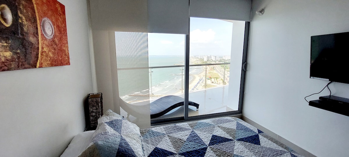 One bedroom apartment with an amazing view on the 20th floor. Located less than 10 min. away (by taxi) from the Old City, and around the building you can find tons of places to eat or drink anything you want… It's your perfect hub for your next visit to Cartagena! The building has a 24/7 concierge and an outdoor swimming pool (as well as another one for kids) as well as sauna, jacuzzi and gym. Please keep in mind that only registered guests are allowed to access the building.