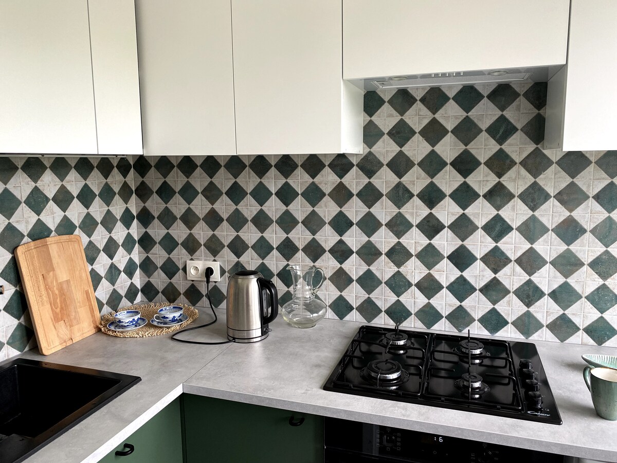 公寓位於市中心附近( 7公裏,開車10分鐘) ,靠近巴士站和街區下方的免費停車位。 公寓位於一個安靜區域的社區。 室內非常舒適,配備所有必要的設備、快速WiFi、配備智慧電視的55吋電視( YT、Netflix、HBO GO等)、配備設備的廚房(盤子、馬克杯、玻璃杯、刀具、熱水壺、鍋具、平底鍋、帶爐臺的烤箱、洗碗機、冰箱、冰櫃、洗衣機等)。