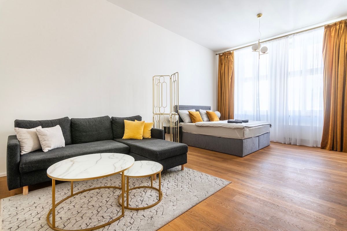 在這座 15 世紀建築的中心,陽光透過寬敞的窗戶灑落,你可以在裝飾精美的躺椅上放鬆身心,細細品讀一本書。沉浸在舒適的轉角沙發中,沉浸在華麗的古董家具和奢華的中性織物的混合中。 公寓位於兩個主要廣場之間:舊城廣場和溫塞斯拉斯廣場,可欣賞到The Estates Theater的角落景觀。它也靠近主要的中央地鐵站Mustek。