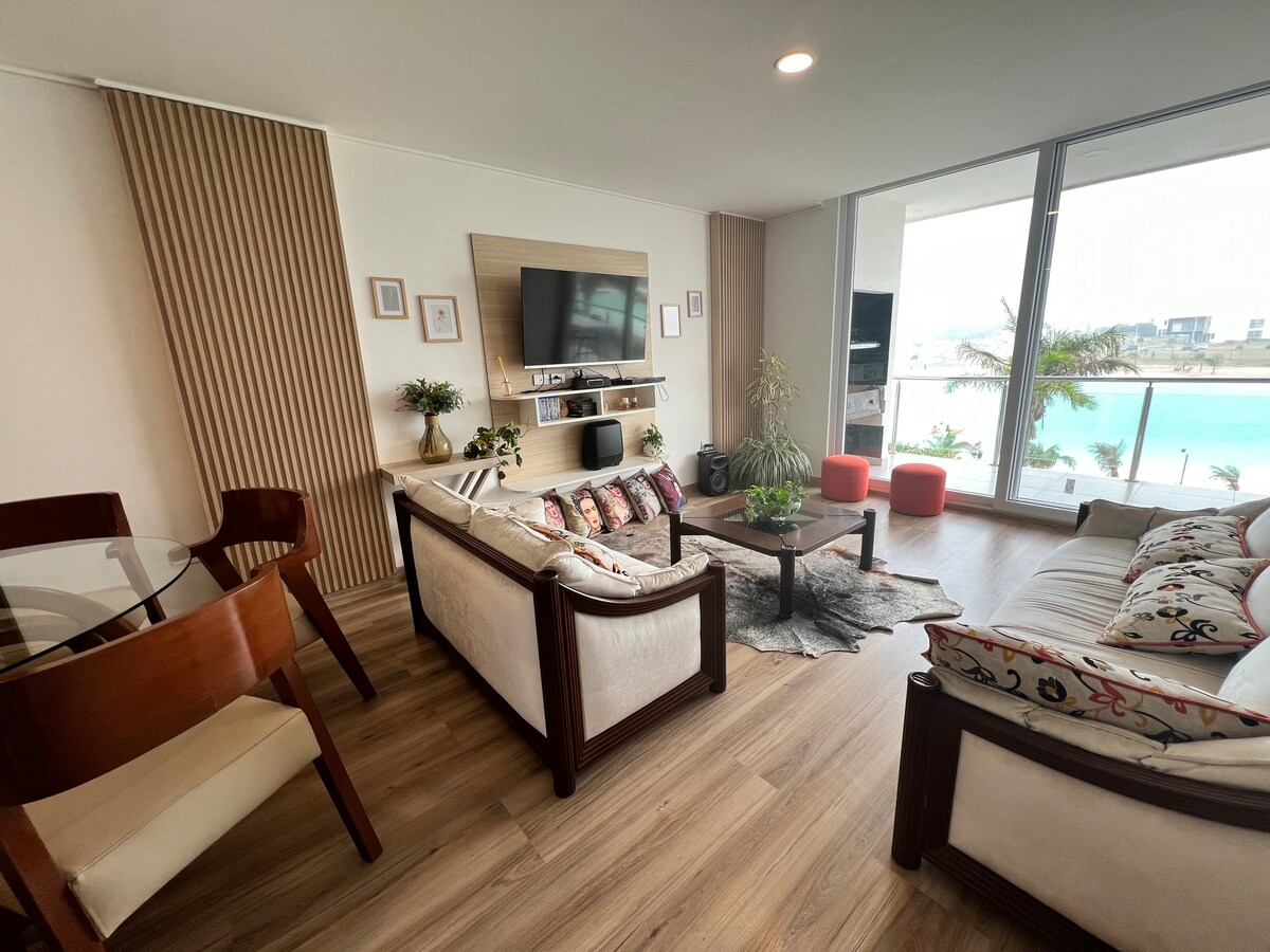 在我們位於獨家的 Mar Adentro 住宅區的舒適公寓中,探索海灘前的寧靜。這個明亮的空間有兩間寬敞的房間和兩間浴室,提供舒適和隱私。從寬敞的陽台上欣賞令人難忘的日落,陽台上還配有烤肉架,讓您在戶外享用晚餐。沉浸在我們家的寧靜中,人工海洋和海風等待著您度過難忘的假期