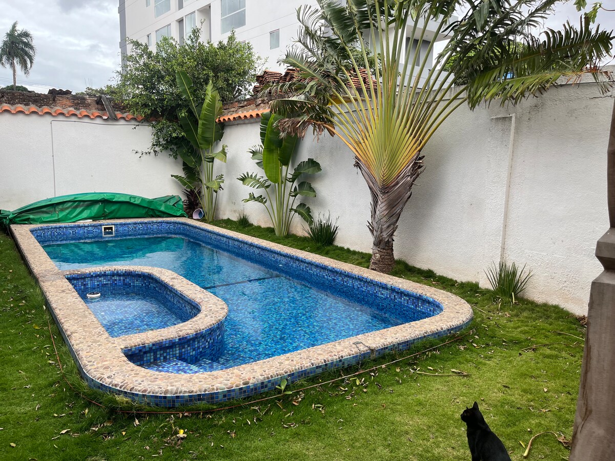 完整的中央公寓,配有巨大的花園和泳池。 配有全套廚房、獨立浴室和一間配有標準雙人床的臥室的私人公寓。 您還可以使用大花園和泳池放鬆身心。 選擇我們的住宿,你也能支持當地非政府組織 Ñañope,該組織致力於為聖克魯斯的家庭工人提供支援。