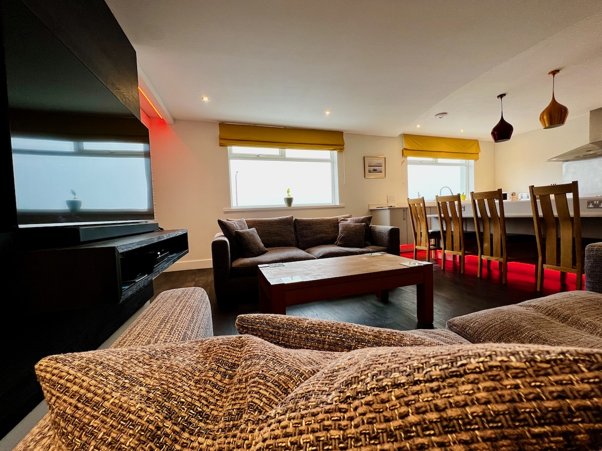 Right on the promenade with stunning views accross Morecambe Bay and opposite the iconic Art Deco Midland Hotel this newly renovated contemporary apartment features a new fully equiped kitchen diner with 6 seater island and high spec integrated appliances. The living area adjoins the diner with two oversized sofa's and 65" smart Samsung TV and soundbar. Sleep soundly in hotel quality king size beds with ample fitted wardrobes. Plus a 2nd TV snug , sun room and large roof terrace.