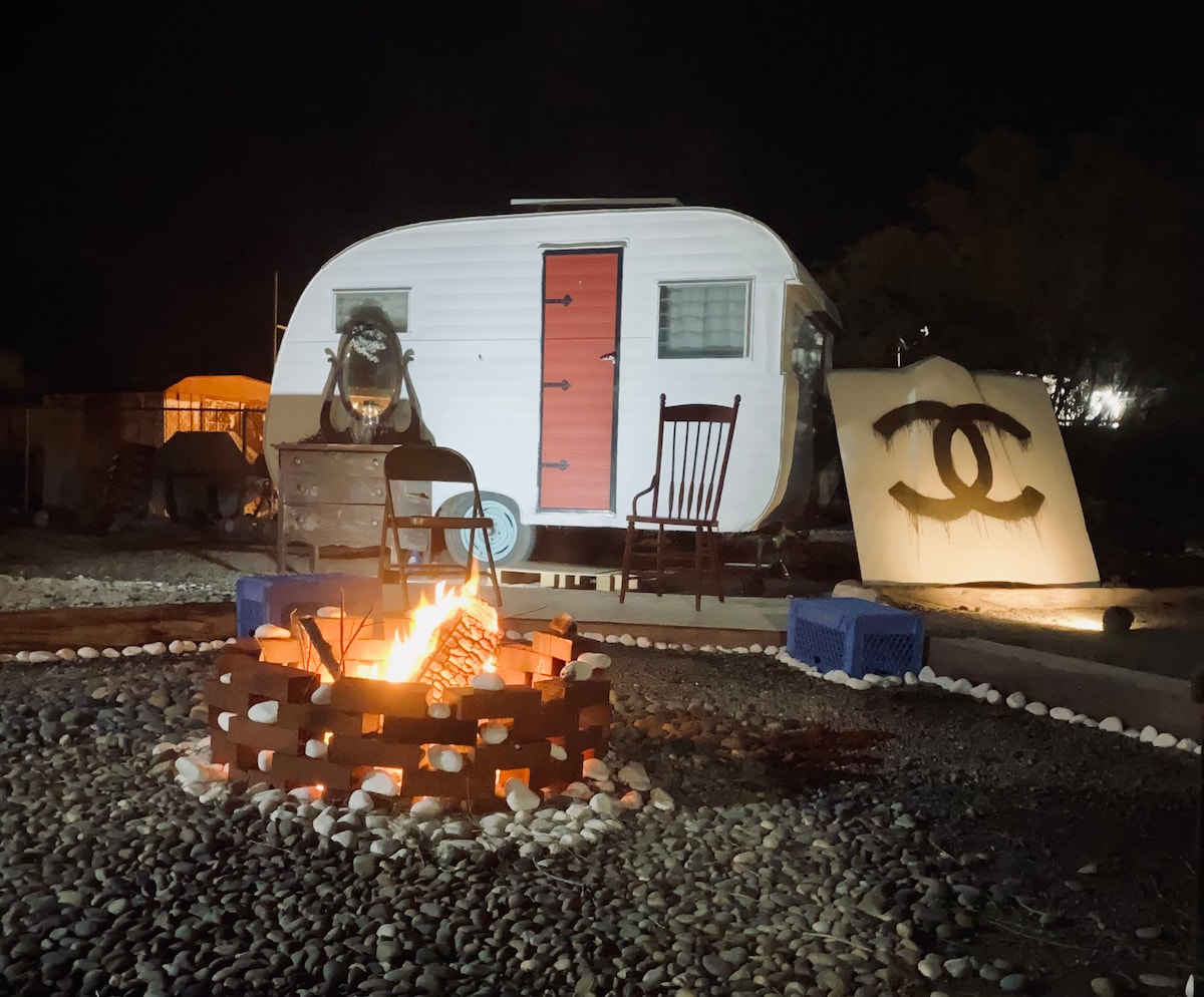 在索爾頓海( Salton Sea )的北岸,距離海灘半個街區,在主屋後面,在桉樹下,有一輛32英尺的80年代Layton拖車,是您沙漠探險的完美度假勝地。 保留所有原創,並以獨特的藝術品裝飾此房源非常適合兩人入住,配有廚房、浴室和舒適的臥室、起居區域、戶外用餐區域、烤架/火坑、附近房間配有淋浴間和洗衣房的第二間浴室以及停車場。