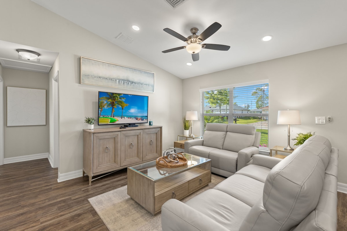 Relax with the whole family at this peaceful place to stay which features: *2200 Sq. Ft *10-foot windows and doors *Private large, screened in Lanai *Large heated SaltwaterPool & Spa *Outdoor kitchen, living room w/TV, and dining area *Fully stocked and equipped Kitchen *Nespresso Coffee Machine *Off street parking, driveway will accomodate 2 vehicles *Safe Neighborhood *On the canal. Room to tie up a boat or two *1 walkable Mile to coffee shops, and several restaurants