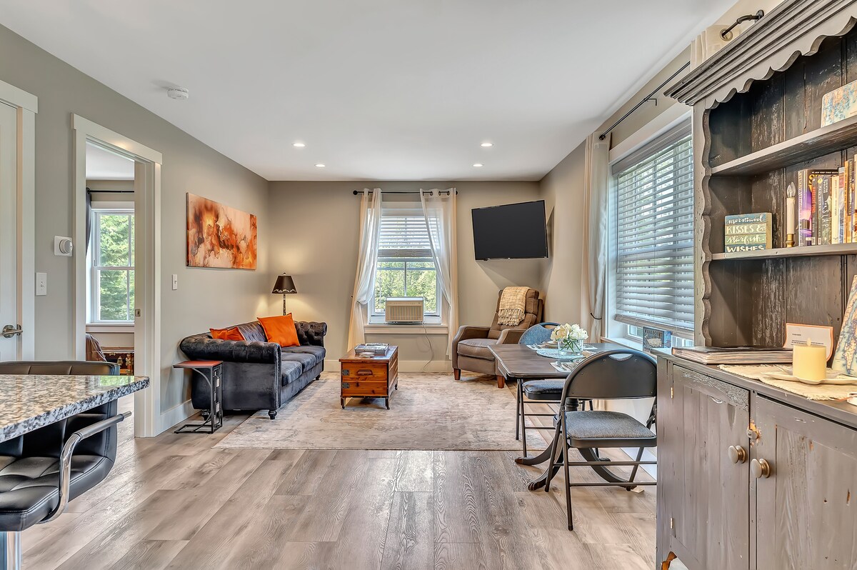 全新現代化公寓,俯瞰車庫。 全新的露臺和火坑區域。 坐落在森林中。距離市中心風景優美的Boothbay Harbor和植物園10分鐘路程。 靠近Carriage House餐廳。 靠近Ocean Point。大型步入式衣櫥。 兩臺大型平面電視。 燒烤架、火坑和室外用餐區,配有桌子和椅子。 玉米洞和戒指遊戲。 棚子裡有木柴供房客使用。 電動車充電器插座,收取少量費用。