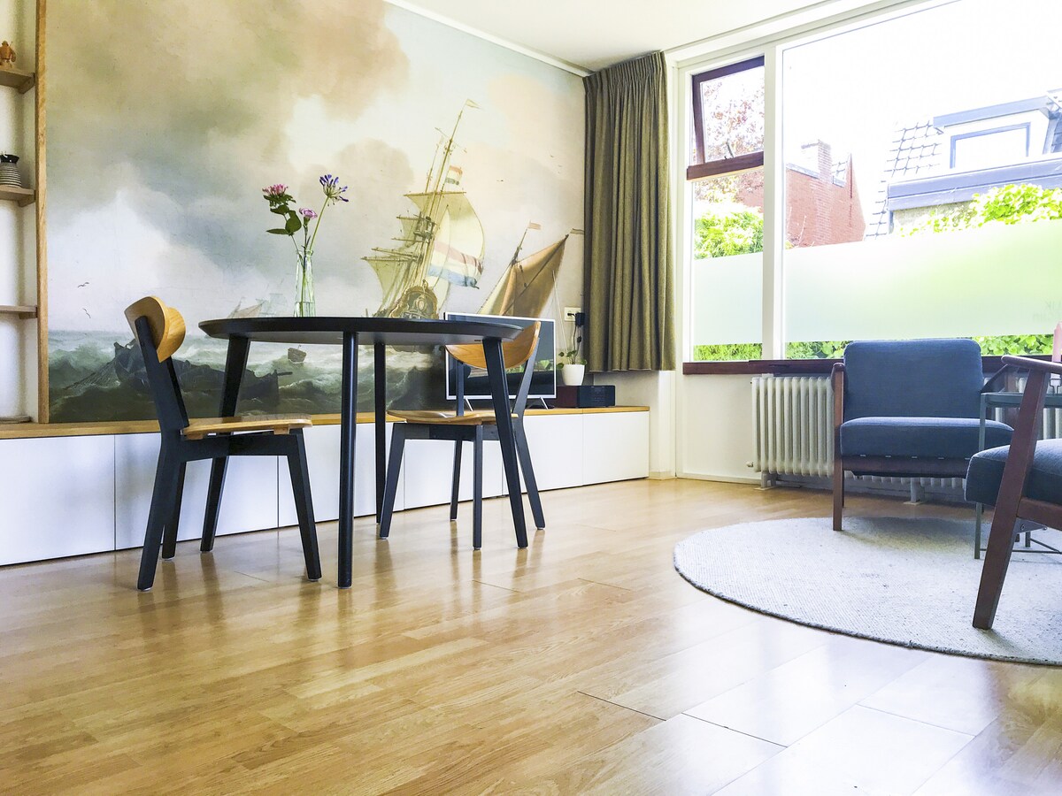 Sfeervol verbouwd appartement met grote tuin.