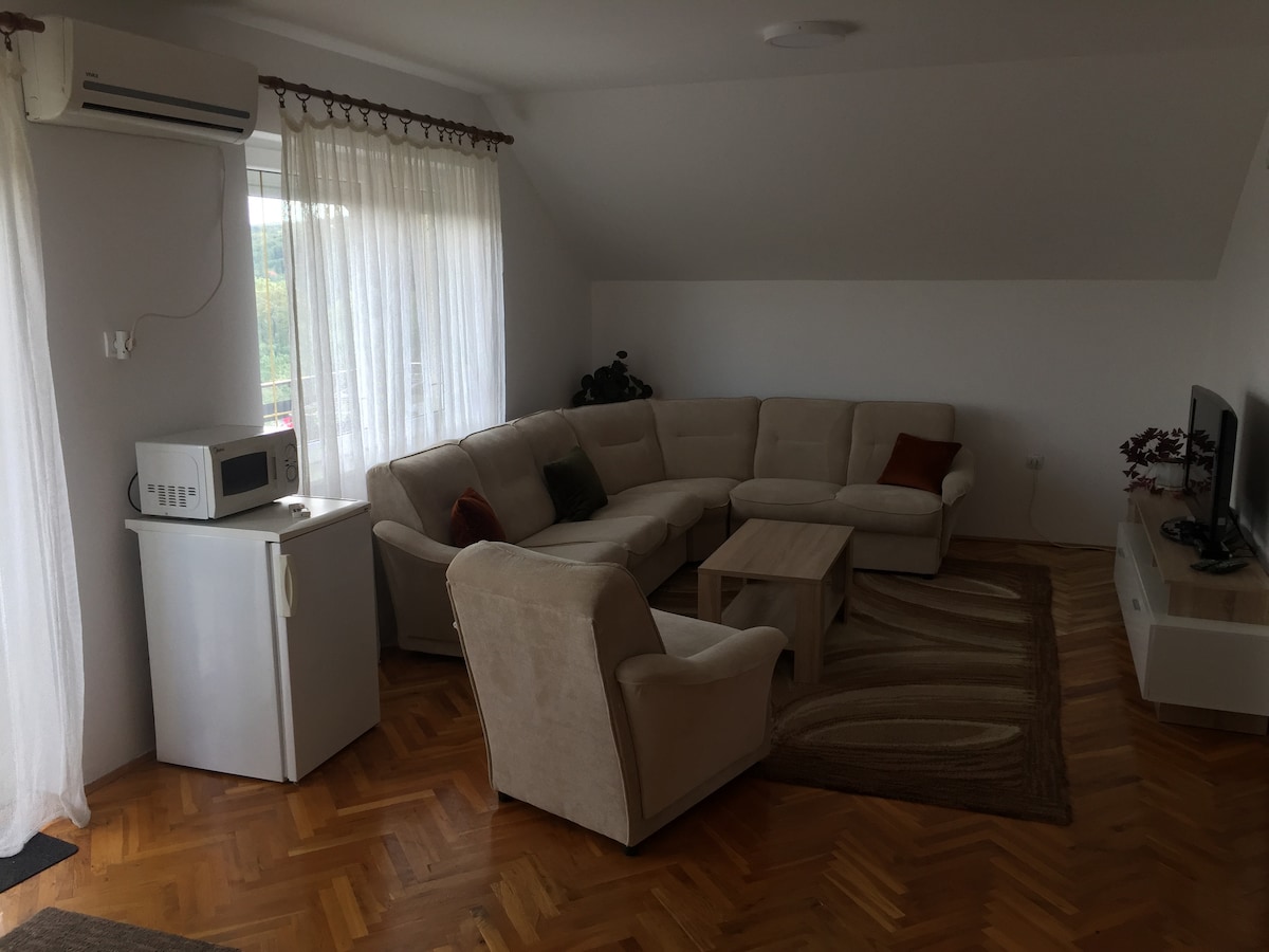 Relax in this spacious, elegant mountain villa. In the immediate vicinity, there are many tourist attractions, waterfalls, caves and forests, making it perfect for sightseeing, walking. The villa itself has two bedrooms on the first floor with double beds and a terrace in each bedroom, while on the ground floor there is a large living room, a kitchen with dining table for six people and a bathroom. In the courtyard of the villa there is an outdoor fireplace with swings. There is also a barbecue.