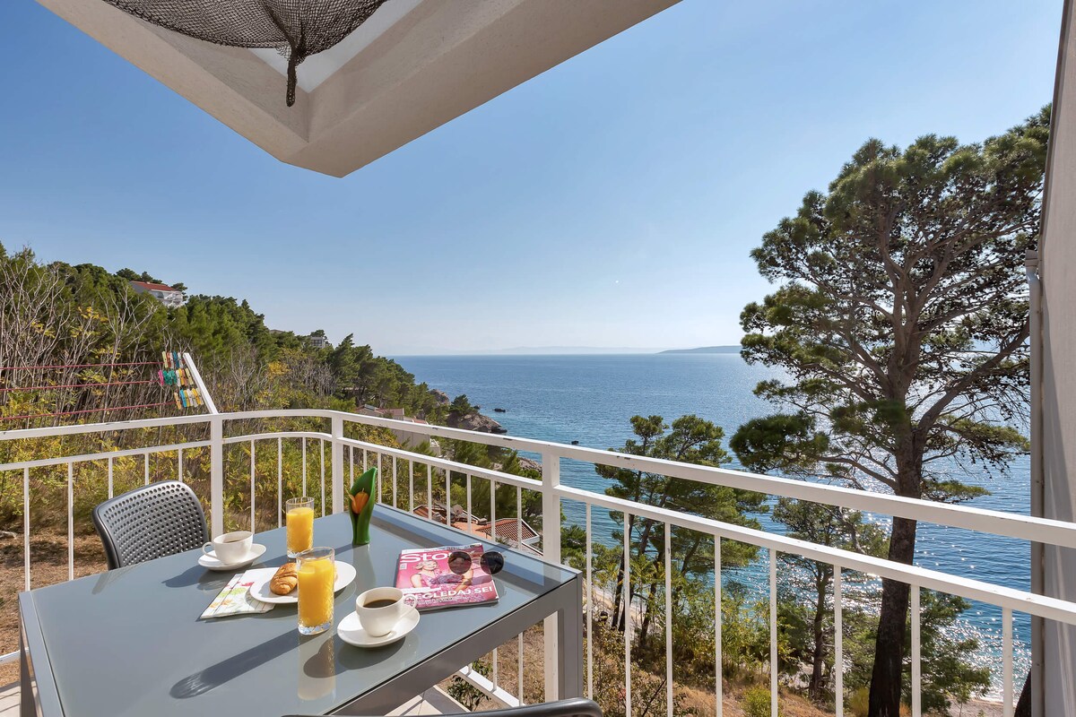 公寓有一間臥室,配有雙人床、浴室、廚房、衛星電視、空調、免費Wi-Fi、陽臺,可欣賞海景。 我們的房子前面有一個游泳池供房客使用。 它位於一樓,我們的房子位於布雷拉(Brela)的西部,遠離噪音和人群。 我們的優惠還包括早餐,每人收費15歐元。
