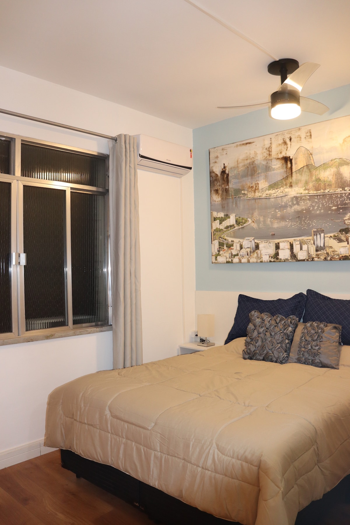 乾淨的單間公寓,配有標準雙人床。 Airbnb可欣賞瓜納巴拉灣( Guanabara Bay )和糖麵包( Sugar Loaf )令人嘆為觀止的正面景觀。 在里約熱內盧最美的景色中欣賞日出。 有家庭辦公室的桌子、窗戶式空調、智慧電視、冰箱和冰櫃。 兩個環形瓦斯爐,公寓有過濾器和天花板風扇,可用於客廳和臥室。 溫水淋浴。 步行5分鐘即可抵達地鐵站。