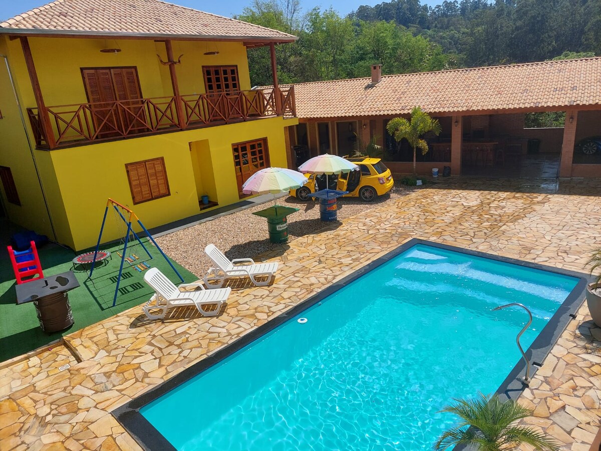 Recarregue as energias ao ficar nesta neste maravilhoso lugar rústico, temático e aconchegante. Churrasqueira de Kombi, sofá de fusca, mesa de sinuca de kombi, piscina grande e climatizada, wi-fi, lugar seguro com câmeras de segurança pertinho do Centro da cidade, da rodovia e o melhor… Sem estrada de chão!